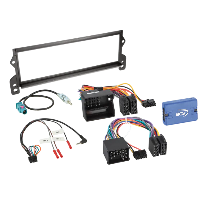 BMW Mini Installation Kit. Supplied With i-Bus Steering Wheel Control Interface With Quadlock And 17 Way Round Pin Leads, Single DIN Fascia Plate, FAKRA Antenna Adapter & Universal Patchlead