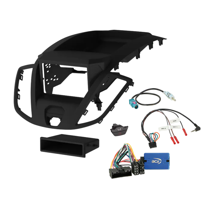Complete installation kit including Black double DIN fascia panel and black top hood, steering wheel control interface, antenna adapter and universal patch lead.