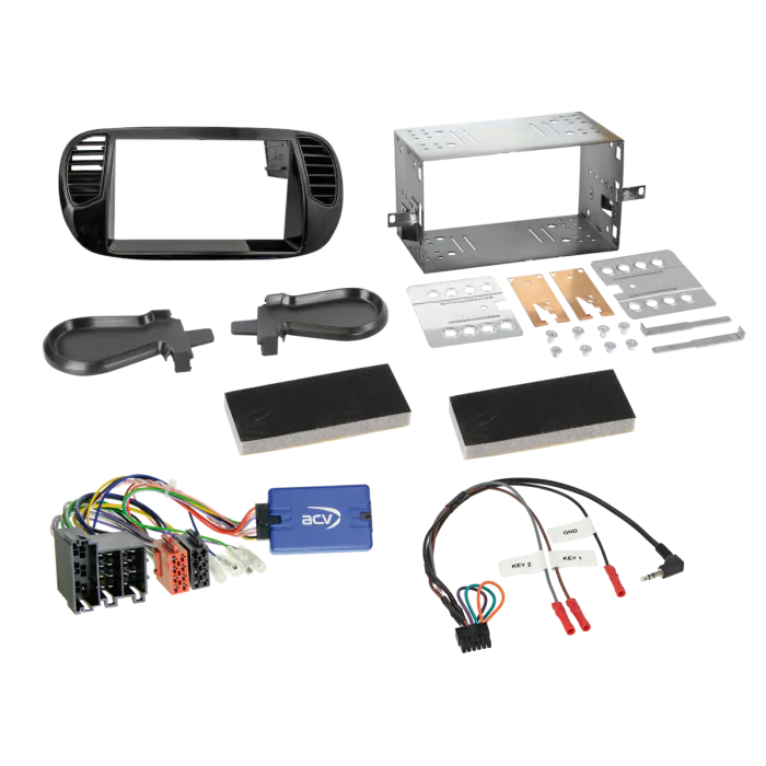 Fiat 500 Installation Kit. Supplied with Black Double DIN Fascia, CAN-Bus Steering Wheel Control Interface, Blue & Me extension cable & Universal Patchlead
