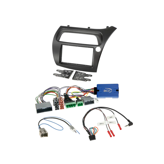 Honda Civic Hatchback Installation Kit. Supplied with a black double DIN fascia, a steering wheel control interface, an antenna adapter & a universal patchlead.