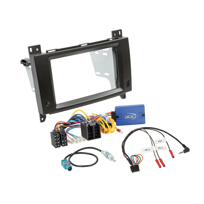 Mercedes Installation Kit. Supplied With Black Double DIN Fascia, Steering Wheel Control Interface, FAKRA Antenna Adapter & Universal Patchlead