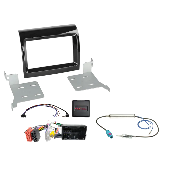 Installation Kit for Peugeot Boxer vehicles. This kit is supplied with a double DIN fascia panel, a steering wheel control interface, an antenna adapter and a universal patchlead