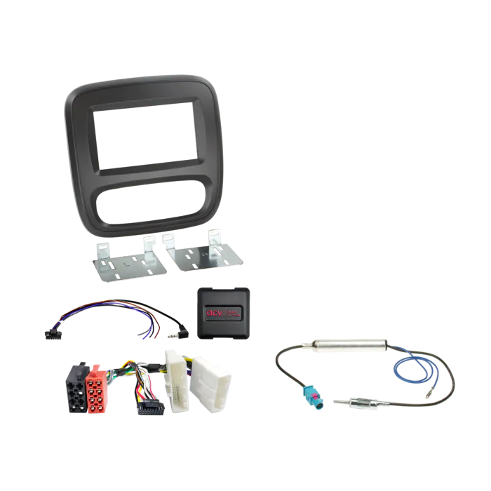 Installation Kit for the Renault Trafic. This installation kit comes supplied with a matte black (with black trim) double DIN fascia panel - with accessories - a steering wheel control interface, an antenna adapter and a universal patchlead.