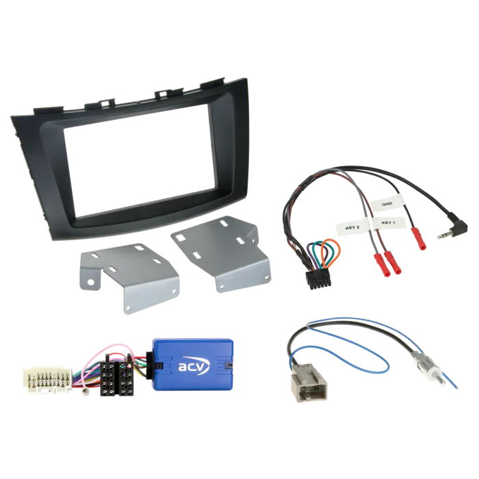 Suzuki Swift Double Din Installation Kit with double din fascia and steering wheel control interface. This kit allows you to replace the factory stereo of your vehicle whilst maintaining the OEM steering wheel controls and the look of the factory dash