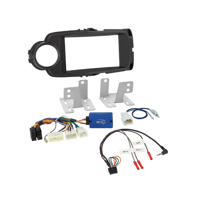 Toyota Yaris Installation Kit. Supplied With Silver Double DIN Fascia, Resistive Steering Wheel Control Interface, Antenna Adapter & Universal Patchlead