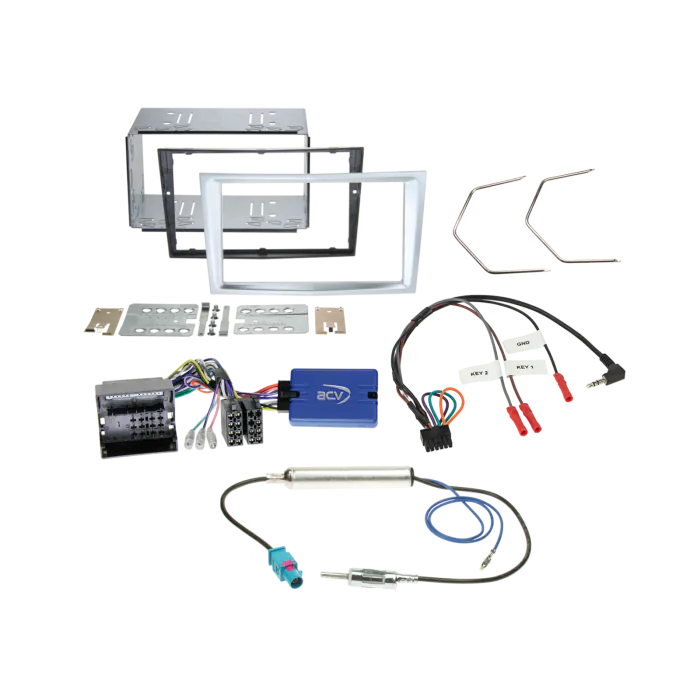 Vauxhall Installation Kit. Supplied With Matte Chrome Double DIN Fascia, CAN-Bus Steering Wheel Control Interface, Vauxhall Release Keys, FAKRA Antenna Adapter & Universal Patchlead