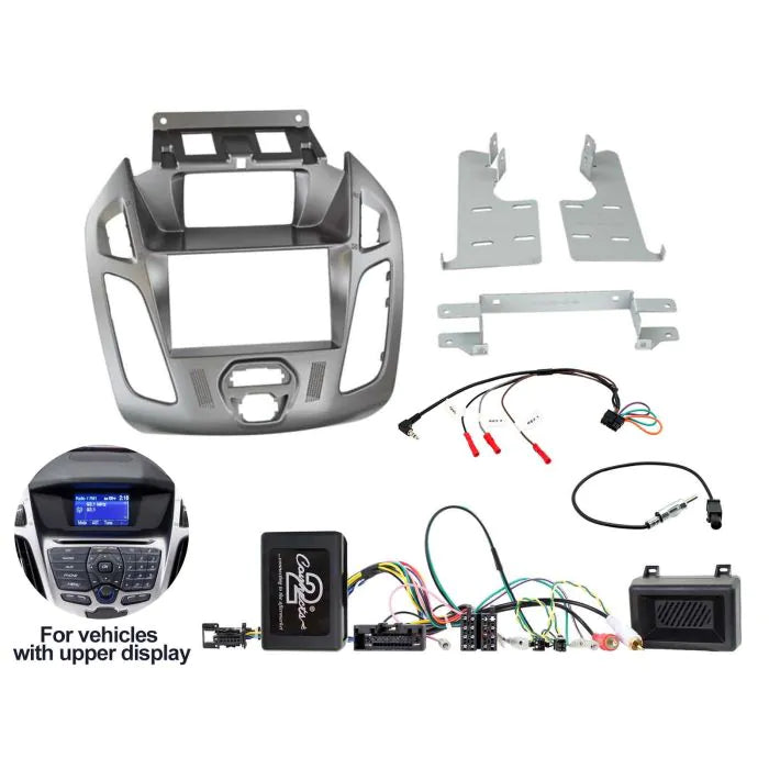 Complete installation kit for Ford Transit vehicles that feature a factory upper display. This kit includes a phoenix matte silver double DIN fascia panel, a steering wheel control interface, antenna adapter and a universal patch lead.