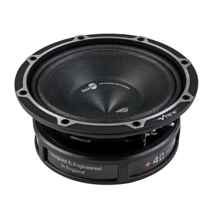 THE BLACKDEATH 6 INCH PRO AUDIO COMPONENT WOOFER IS DESIGNED WITH EXCELLENT MID-BASS RESPONSE IN MIND. SEMI-PRESSED PAPER CONE HAS HIGH SENSITIVITY AND LOW MOVING MASS FOR MONSTROUS OUTPUT DUAL ROLL CLOTH SURROUND OFFERS FAST, PRECISE DAMPENING OF THE CONE WITH GREAT BASS RESPONSE. THE BLACKHOLE DUSTCAP INCREASES EFFECTIVE CONE AREA FOR HIGHER SPL CREATING EXTREME VOLUME.